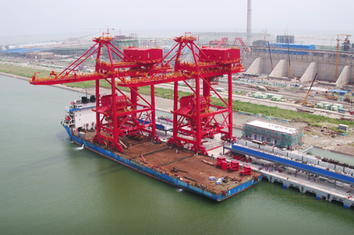 3#泊位首批上岸的两台1800t桥式抓斗卸船机,由上海振华重工历经8个月精心制造。该卸船机在环保、节能、便于自动化改造等方面优势突出,可满足5万吨级矿船的作业需求,其额定作业能力达每小时1800吨,用于铁矿石、辅料的卸船作业,由皮带机连接后方原料厂区。8#泊位上岸的两台1500t桥式抓斗卸船机,由南通润邦重机制造,用于煤炭的卸船作业,由皮带机连接后方焦化煤场。