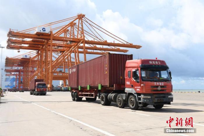 图为8月26日,钦州港码头货车正在运输货物。 中新社记者 林浩 摄