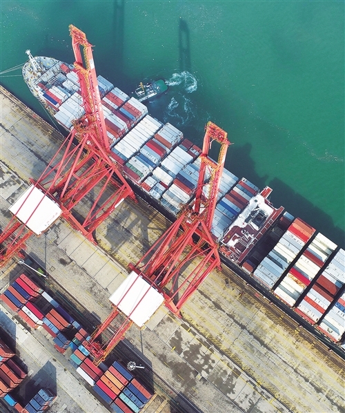 10月9日,江苏连云港港集装箱码头,一艘大型集装箱船舶装载集装箱后准备离港远航。今年以来,江苏连云港港克服天气、疫情等因素影响,努力助推货物运输上量。据统计,连云港港今年前9个月完成吞吐量2.11亿吨、同比增长11.41%,集装箱374.64万标箱、同比增长3.75%。王健民摄(中经视觉)