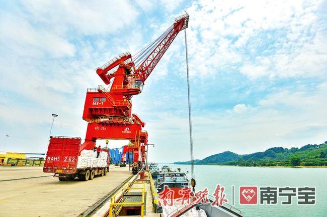 ▲在南宁港六景港区内,工作人员有序装卸货物。本报记者 黄维业 摄