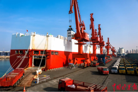 11月2日,以星航运“智利瑟冰”轮靠泊山东港口青岛港大港港区,标志着青岛港首条以星航运滚装航线——“红海航线”开通,将有力推动青岛港汽车滚装出口业务迈入融合发展、高速发展新时代。