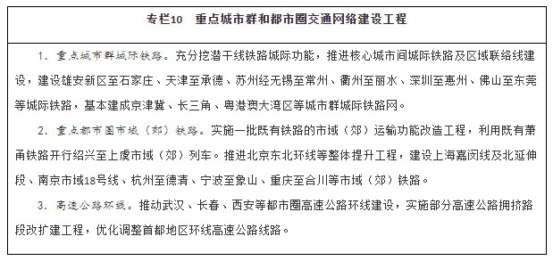 强化重点城市群城际交通建设。围绕京津冀、长三角、粤港澳大湾区、成渝、长江中游等城市群,以轨道交通、高速公路为骨干,提升城际运输通道功能,加强核心城市快速直连,构建多节点、网络化的城际交通网,实现城市群内主要城市间2小时通达。整体推进京津冀、长三角、粤港澳大湾区城际铁路和市域(郊)铁路建设,有序推动成渝地区双城经济圈城际铁路和市域(郊)铁路建设,加强与高速铁路、普速铁路一体衔接,扩大对5万人口以上城镇的有效覆盖。