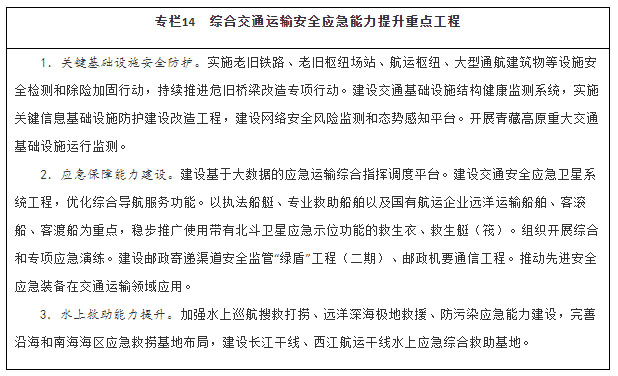 健全综合交通运输应急管理体制机制,完善应急协调机制和应急预案体系,加强交通运输调度与应急指挥平台建设。推进区域性公路应急装备物资储备中心建设。加强水上交通安全监管、航海保障和救助打捞能力建设,完善沿海和内河溢油应急设备库,构建陆海空天一体化水上交通运输安全保障体系。建设城市轨道交通应急演练中心。以骨干航空物流企业为主体构建航空应急服务网络。建设海事监管指挥系统。在开展城市交通基础设施地下空间、低洼区域、重点区段、重要点位、关键设施等隐患排查基础上,建立健全风险台账和灾害隐患清单,补齐设施设备、应急抢险物资等短板,持续完善应急处置预案,健全应急响应机制,提升应对极端天气能力。加强应急专业队伍和志愿者队伍建设,充实国家应急运输储备力量。健全应对重大疫情、防范应对恐怖袭击、保障信息安全等非传统安全应急指挥体系和应急交通组织。