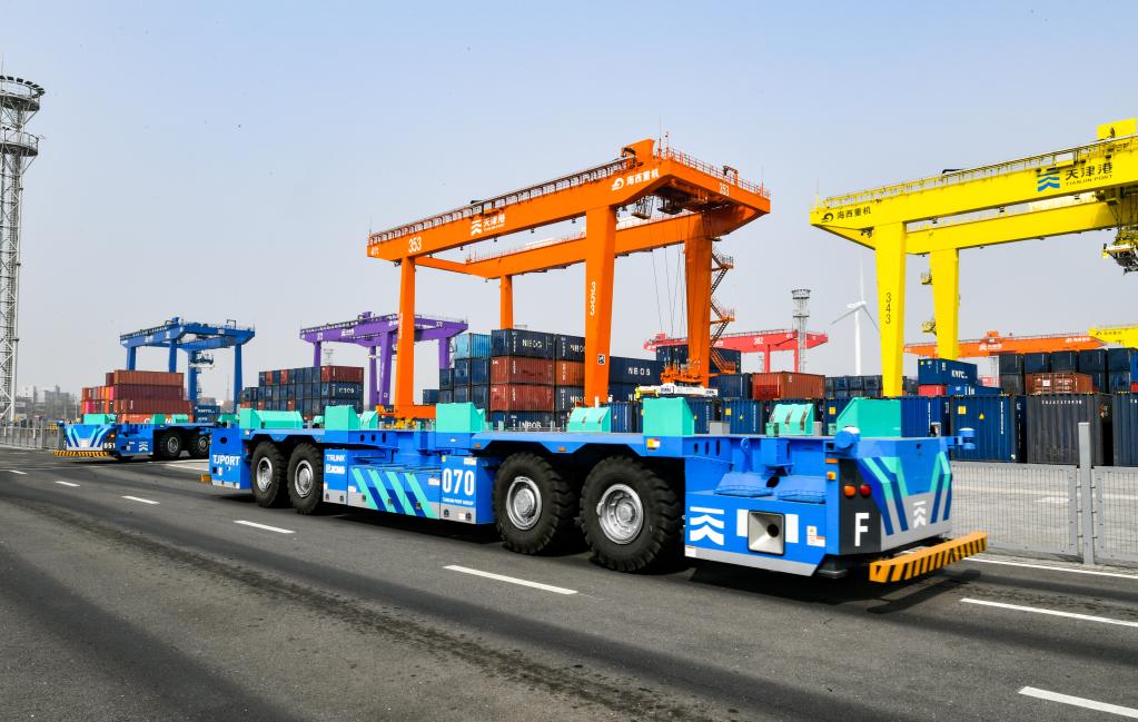 4月9日,在天津港北疆港区C段智能化集装箱码头,智能水平运输机器人在堆场内行驶。新华社记者孙凡越摄