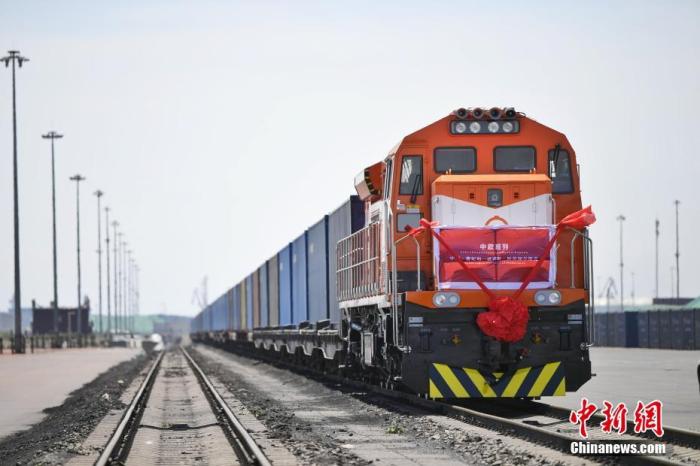 5月25日13时39分,一辆满载建材和设备的班列从河北曹妃甸港区鸣笛启程,该班列将通过满洲里口岸直达俄罗斯后贝加尔斯克。图为中欧班列驶出曹妃甸港通用码头站。 中新社发 赵亮 摄