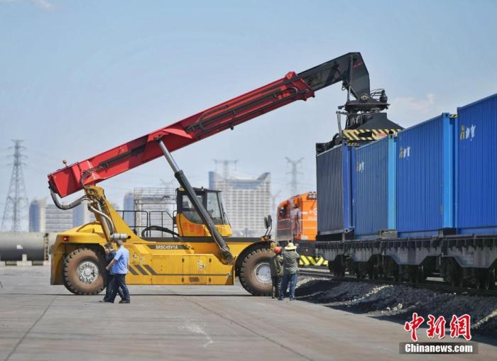 图为工程车辆向中欧班列装载集装箱。 中新社发 赵亮 摄