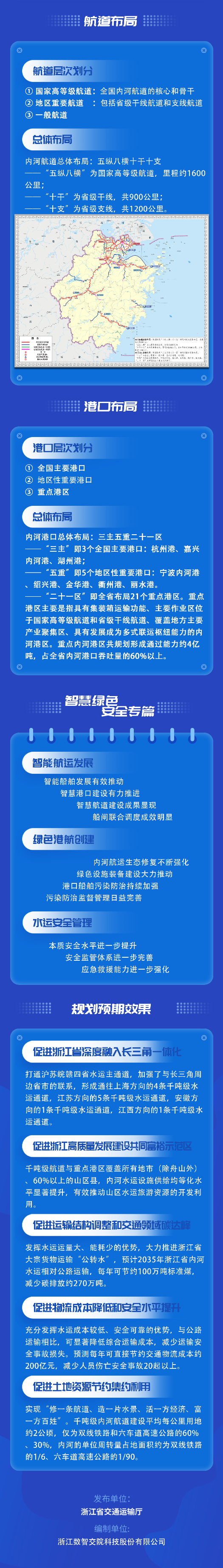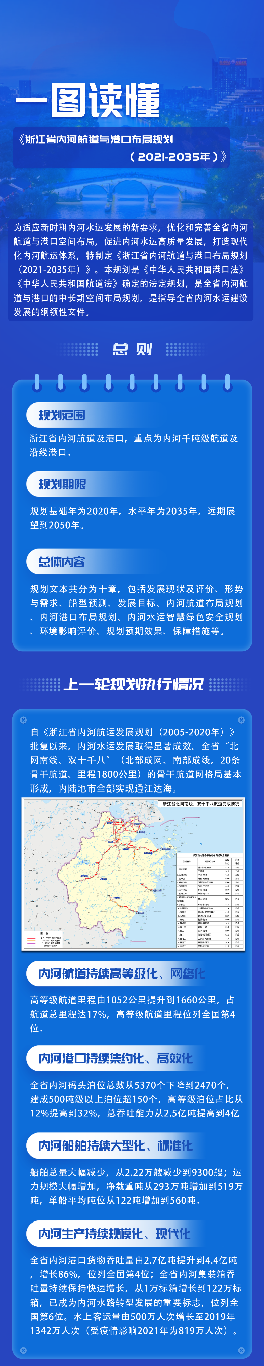日前,经浙江省人民政府同意,《浙江省内河航道与港口布局规划》已由浙江省交通运输厅与浙江省发展改革委联合批复。本规划是《中华人民共和国港口法》《中华人民共和国航道法》确定的法定规划,是浙江省内河航道与港口的中长期空间布局规划,是指导浙江省内河水运建设发展的纲领性文件。规划基础年为2020年,水平年为2035年,远期展望到2050年。主要内容如下: