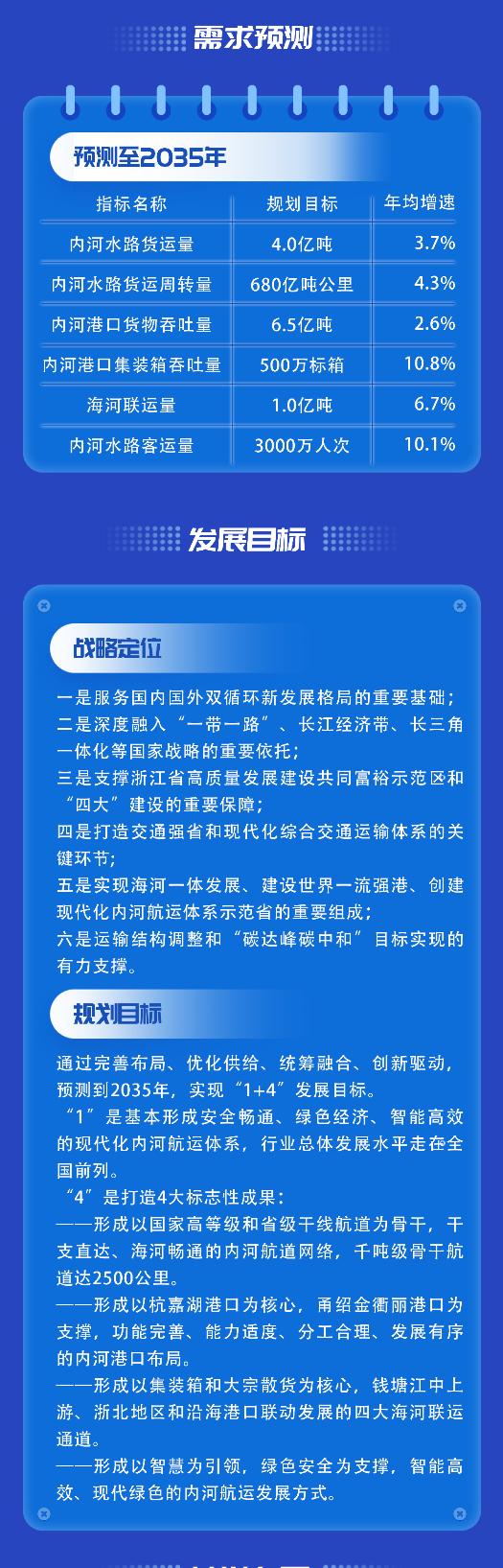 一是实现“1+4”发展目标。“1”是到2035年,基本形成安全畅通、绿色经济、智能高效的现代化内河航运体系。“4”是打造4大标志性成果,即形成以国家高等级和省级干线航道为骨干,干支直达、海河畅通的内河航道网络,千吨级骨干航道达2500公里;形成以杭嘉湖港口为核心,甬绍金衢丽港口为支撑,功能完善、能力适度、分工合理、发展有序的内河港口布局;形成以集装箱和大宗散货为核心,钱塘江中上游、浙北地区和沿海港口联动发展的四大海河联运通道;形成以智慧为引领,绿色安全为支撑,智能高效、现代绿色的内河航运发展方式。