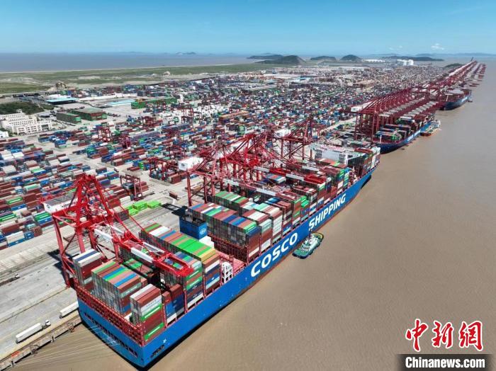 中新网上海8月4日电(记者 陈静)记者4日获悉,7月,洋山深水港集装箱吞吐量超210万标箱,占上海港总吞吐量超49%。生产作业量接近历史峰值,同比增长18.4%,环比增长10.2%。