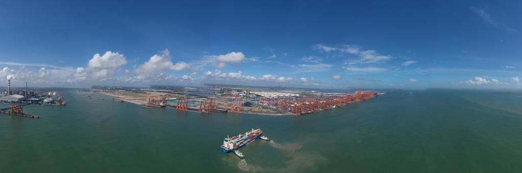 这是8月27日拍摄的平陆运河出海口附近的大榄坪作业区(无人机全景照片)。新华社记者 曹祎铭摄