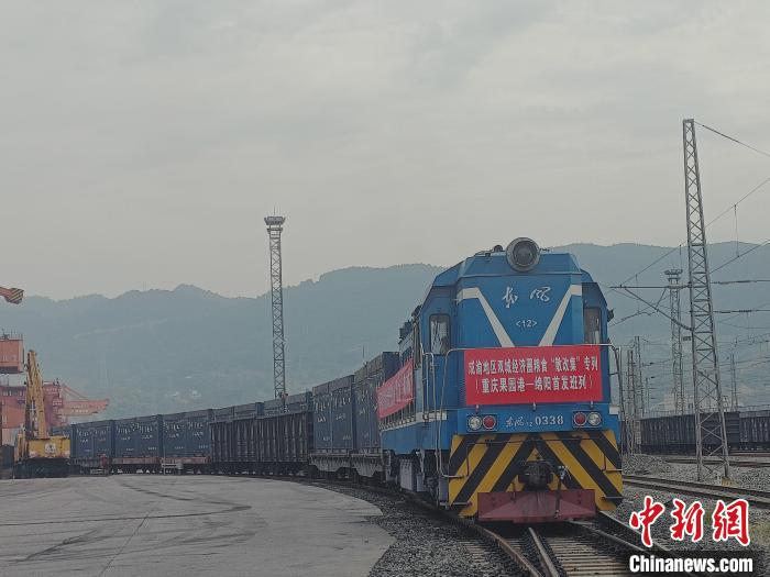 中新网重庆9月7日电 (张旭 王娅)9月7日,伴随着汽笛长鸣,一列载有2400吨优质玉米的成渝地区双城经济圈粮食“散改集”专列从渝怀铁路鱼嘴站缓缓启程,运往四川皂角铺、乐山、公兴等地,确保当地粮食产业链供应链安全稳定。