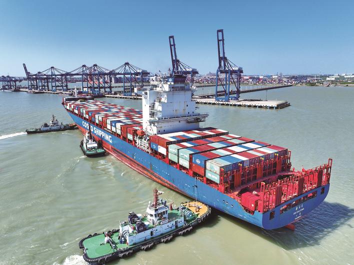 9月19日,集装箱船“新丹东”号靠泊南通港通海港区码头,这是通海港区开港以来作业的首艘最大集装箱船。通海港区是海轮进入长江12.5米深水航道后北岸的第一个港区,是南通重点打造的现代化集装箱港区和江海联运枢纽港。2022年1-8月累计完成集装箱吞吐量107.6万标箱,同比增长9.33%。(许丛军)