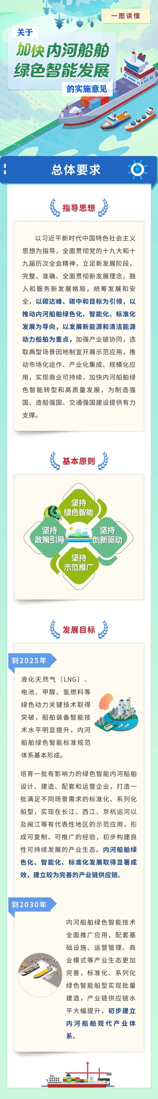 (二)《实施意见》的基本原则。一是坚持政策引导,加强部门、地方、企业协调联动,供需两端共同施策,激发市场主体活力。二是坚持绿色智能,发展绿色造船、绿色船舶、绿色航运,推动新一代信息技术赋能,提升安全绿色发展水平。三是坚持创新驱动,集聚产业链优势资源,推动科技创新、管理创新和商业模式创新,提升发展质量效益。四是坚持示范推广,支持内河流域有代表性的地区先行先试,总结典型经验做法,稳步推广。