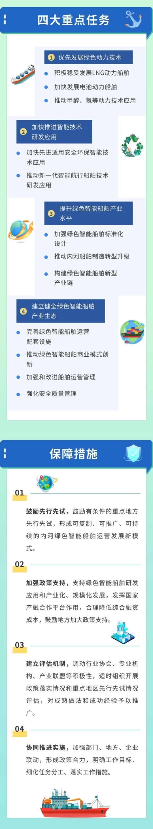为保障主要目标和重点任务顺利实施,《实施意见》提出四方面的措施。一是鼓励先行先试,鼓励有条件的重点地方先行先试,形成可复制、可推广、可持续的内河绿色智能船舶运营发展新模式。二是加强政策支持,支持绿色智能船舶研发应用和产业化、规模化发展,发挥国家产融合作平台作用,合理降低综合融资成本,鼓励地方加大政策支持。三是建立评估机制,调动行业协会、专业机构、产业联盟等积极性,适时组织开展政策落实情况和重点地区先行先试情况评估,对成熟做法和成功经验予以推广。四是协同推进实施,加强部门、地方、企业联动,形成政策合力,明确工作目标、细化任务分工、落实工作措施。