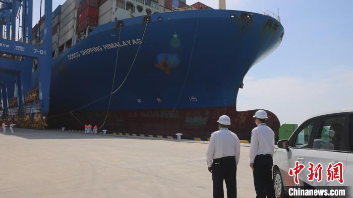 中新网钦州11月2日电(蒋瑞卿 翟李强)11月2日,“中远海运喜马拉雅”轮顺利靠泊钦州保税港区自动化集装箱码头,这也是北部湾港钦州自动化集装箱码头首次迎来15万吨级集装箱巨轮。