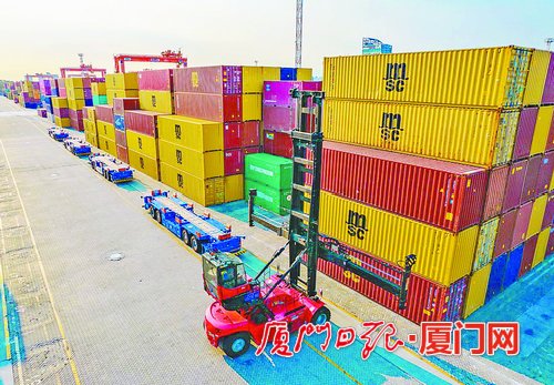 厦门持续推动港口各领域清洁能源替代,推广应用低碳零碳设备,打造“绿色港口”。图为自动驾驶电动集卡配合电动堆高机作业。 (厦门日报记者 许秋珩 摄)