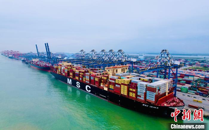 中新网广州4月10日电 (蔡敏婕 曹畅)集装箱船“地中海伊琳娜”号10日靠泊广州港南沙二期集装箱码头,最大装箱量为24346标准箱。据介绍,该集装箱船为现时全球最大集装箱船。