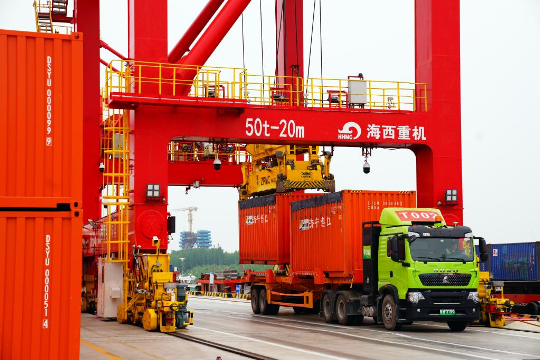 5月12日,货车在济宁能源龙拱港装运集装箱。