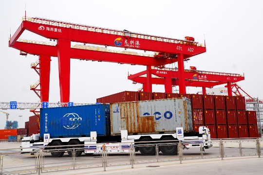 5月12日,无人卡车在济宁能源龙拱港运输集装箱。