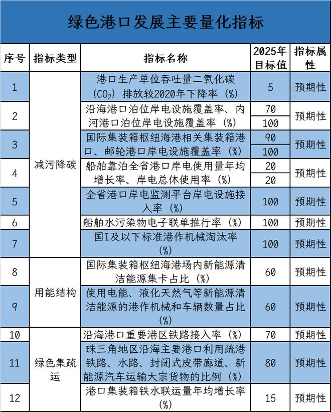 发展目标:到2025年,港口绿色低碳生产方式初步形成,与资源环境协调发展水平稳步提升。基本实现港口资源利用效率明显提高,集疏运体系绿色高效,用能结构显著优化,污染防治取得新成效,绿色管理能力明显提升,生态保护措施全面落实,港口绿色发展水平总体适应交通强省建设的阶段性要求。主要量化发展指标如下表。