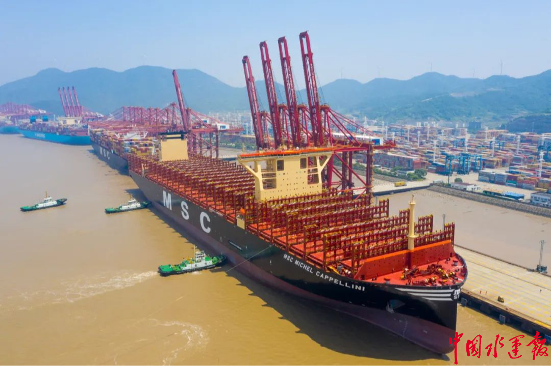 6月2日,我国自主研制的超大型集装箱船“地中海米歇尔卡佩里尼”轮首航首站靠泊宁波舟山港穿山港区集装箱码头4号泊位。