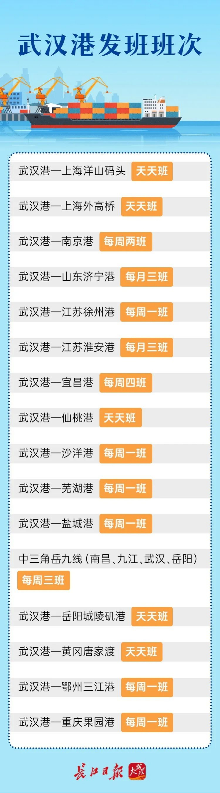 2013年3月,武汉开通武汉—上海洋山港“江海直达”天天班航线。近年来,武汉又先后开通武汉港至江苏徐州港、淮安港、南京港、盐城港,安徽芜湖港、湖南岳阳城陵矶港等集装箱班轮航线,紧密了长江中游航运中心与长三角港口群、中三角港口的对接,让长江中下游与中上游港口的航线衔接发展更加顺畅。