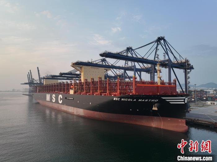 中新网大连6月25日电 (记者 杨毅)全球最大24100TEU(集装箱计数)级超大型集装箱船“地中海尼古拉马斯特罗”轮24日首次靠泊大连港集装箱码头,刷新了辽宁港口集团超大型集装箱船舶挂靠纪录。