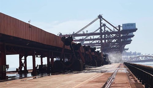 站在唐山曹妃甸港区的矿石码头向海里远眺,一艘艘货轮停泊在锚地里等待着进港装卸货指令。码头边,数十米高的大型装船机挥舞着“手臂”,对停靠在码头的40万吨级的巨轮进行着装船作业。