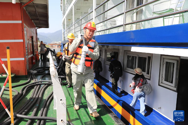 国网宜昌供电公司岸电运维服务人员在为游轮接通岸电。(李治飞 摄)