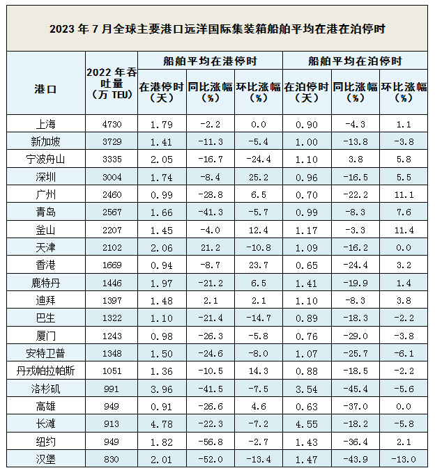 2023年7月全球主要港口远洋国际集装箱船舶平均在港在泊停时