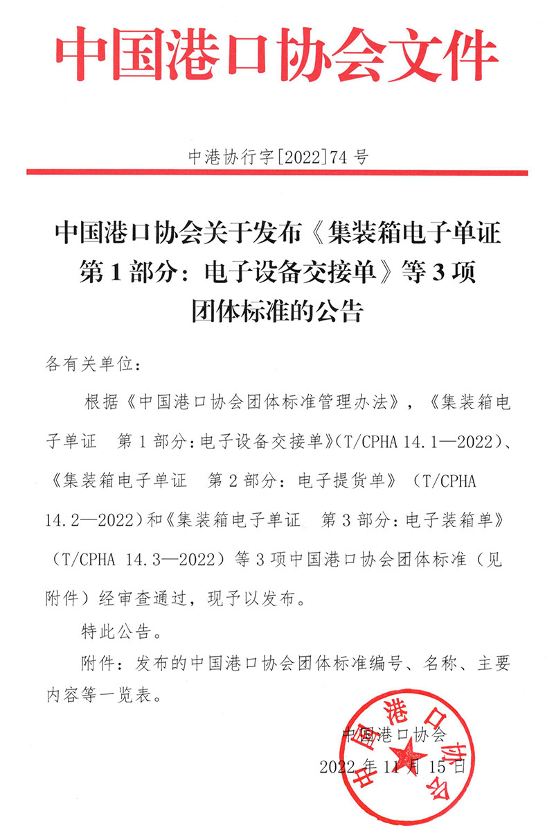 87978797威尼斯关于发布《集装箱电子单证 第1部分:电子设备交接单》等3项团体标准的公告