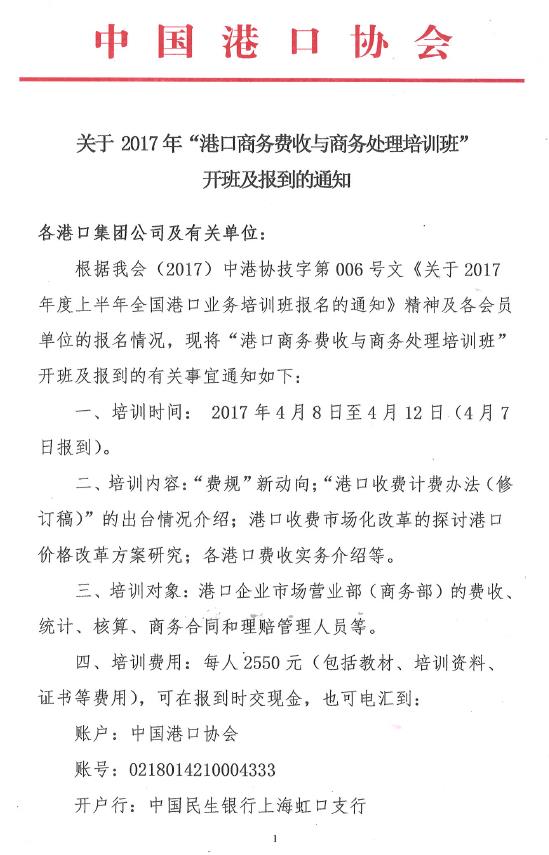 电子版通知下载:关于2017年“港口商务费收与商务处理培训班”开班及报到的通知.pdf