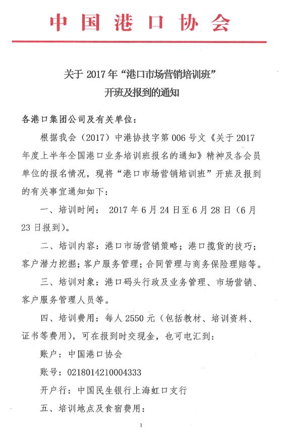 关于2017年“港口市场营销培训班”开班及报到的通知