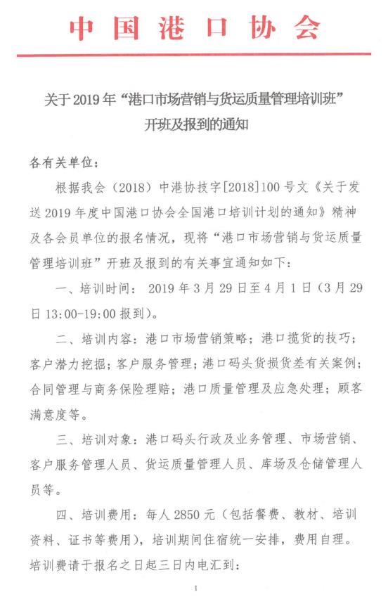 电子版通知下载:关于2019年“港口市场营销与货运质量管理培训班”开班及报到的通知.pdf