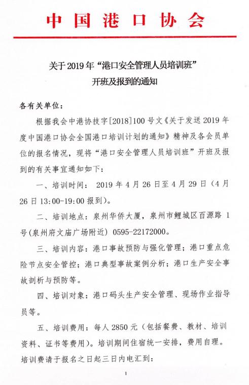 关于2019年“港口安全管理人员培训班”开班及报到的通知