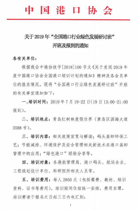 关于2019年“全国港口行业绿色发展研讨班”开班及报到的通知