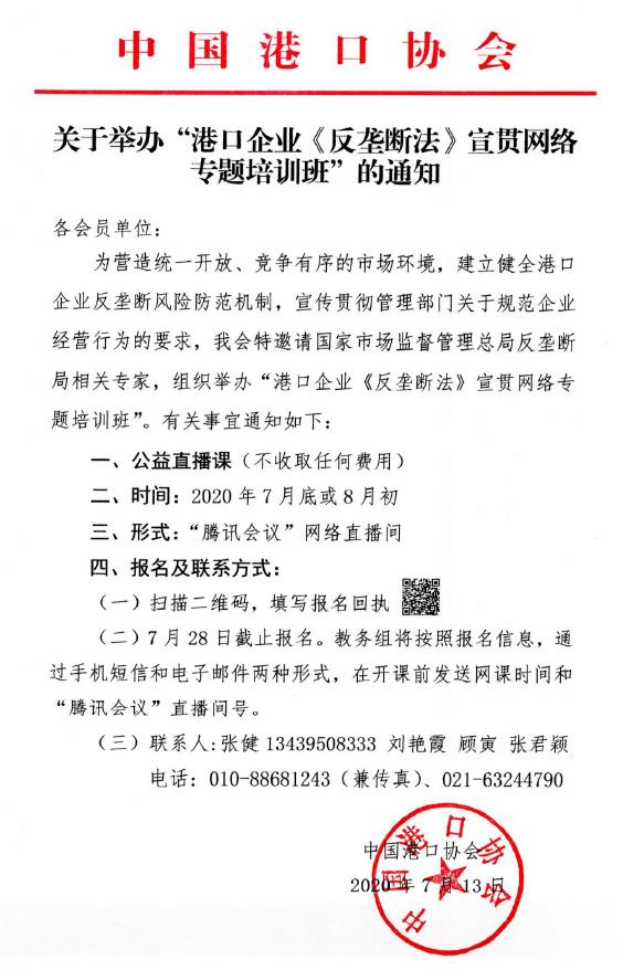 关于举办“港口企业《反垄断法》宣贯网络专题培训班”的通知