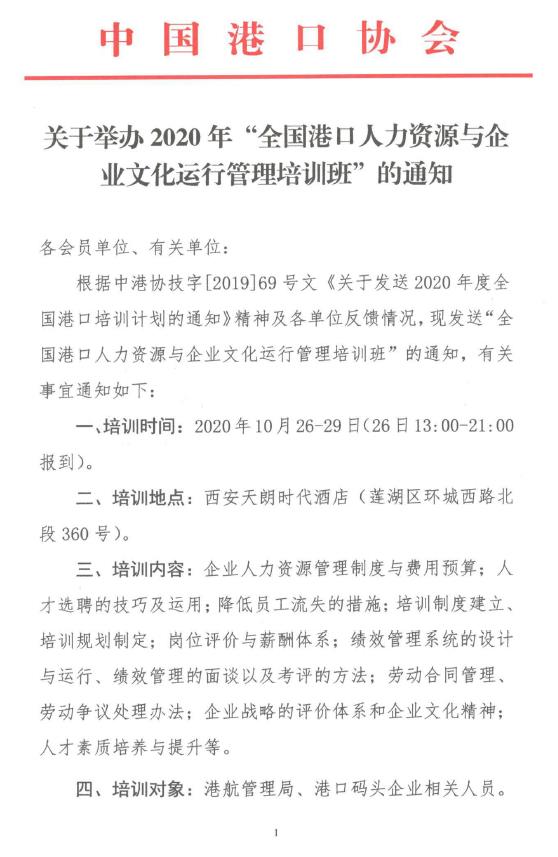 关于举办2020年“全国港口人力资源与企业文化运行管理培训班”的通知