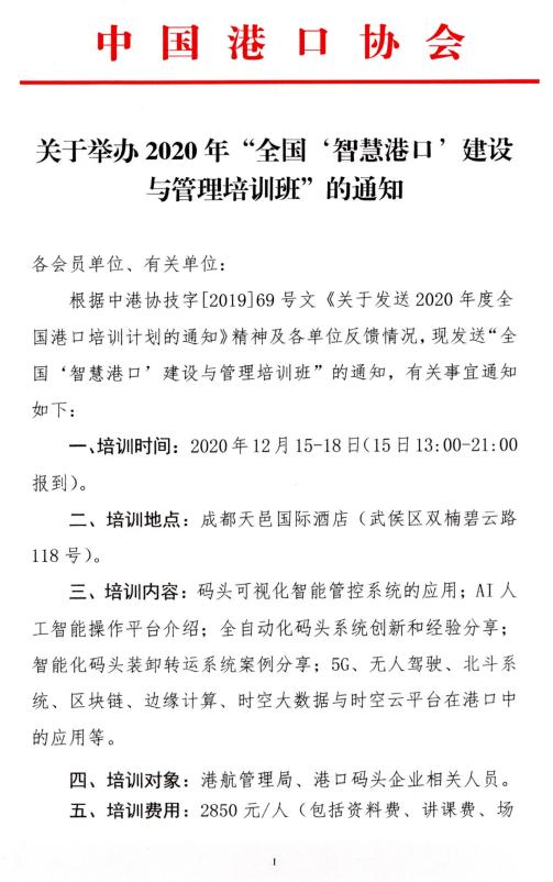 关于举办2020年“全国‘智慧港口’建设与管理培训班”的通知