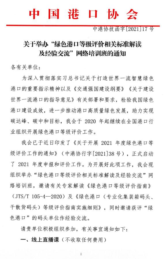 关于举办“绿色港口等级评价相关标准解读及经验交流”网络培训班的通知