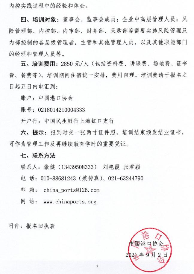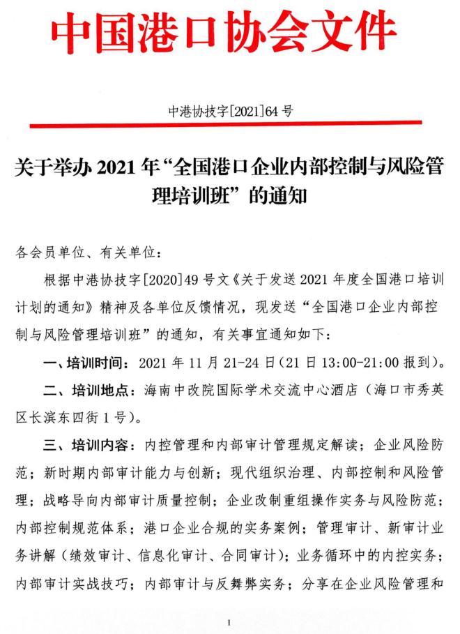 关于举办2021年“全国港口企业内部控制与风险管理培训班”的通知