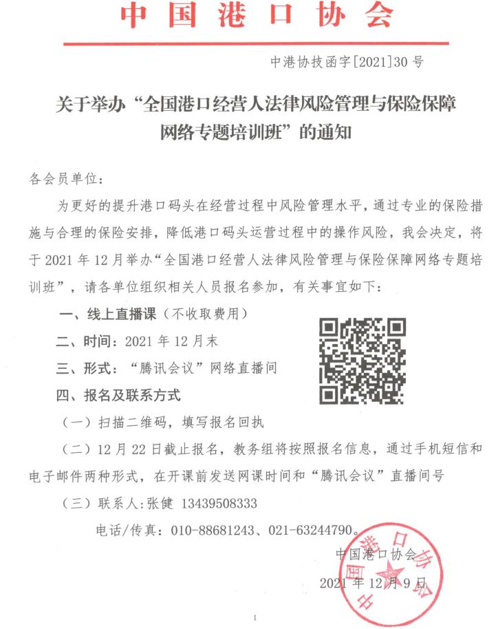 关于举办“全国港口经营人法律风险管理与保险保障网络专题培训班”的通知