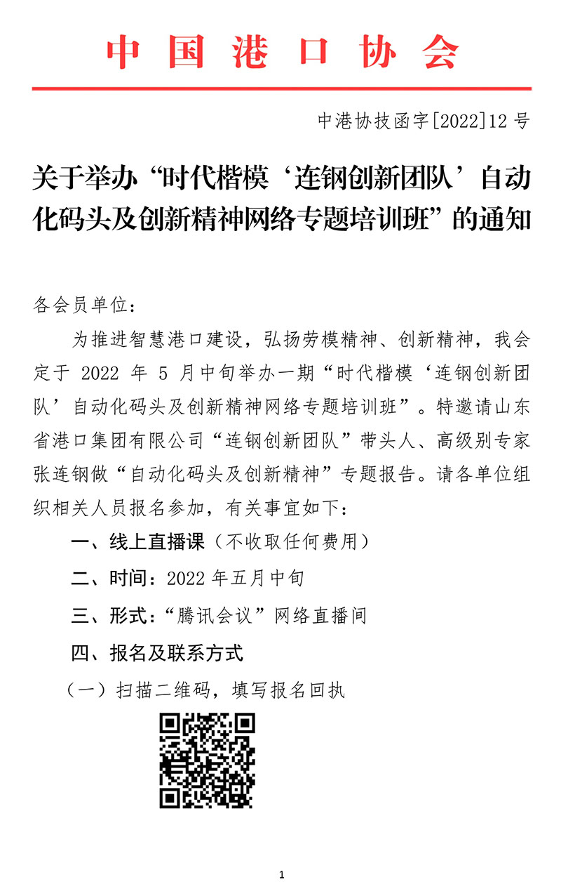 关于举办“时代楷模‘连钢创新团队’自动化码头及创新精神网络专题培训班”的通知