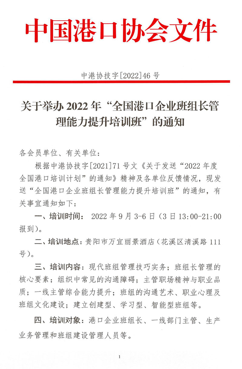 关于举办2022年“全国港口企业班组长管理能力提升培训班”的通知