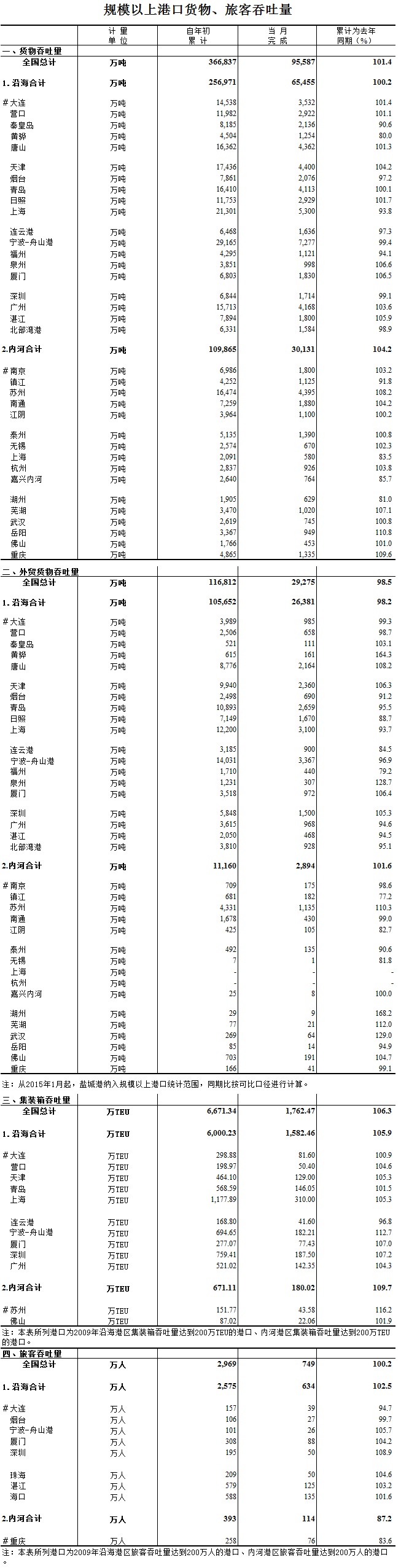 2015年4月规模以上港口货物、旅客吞吐量