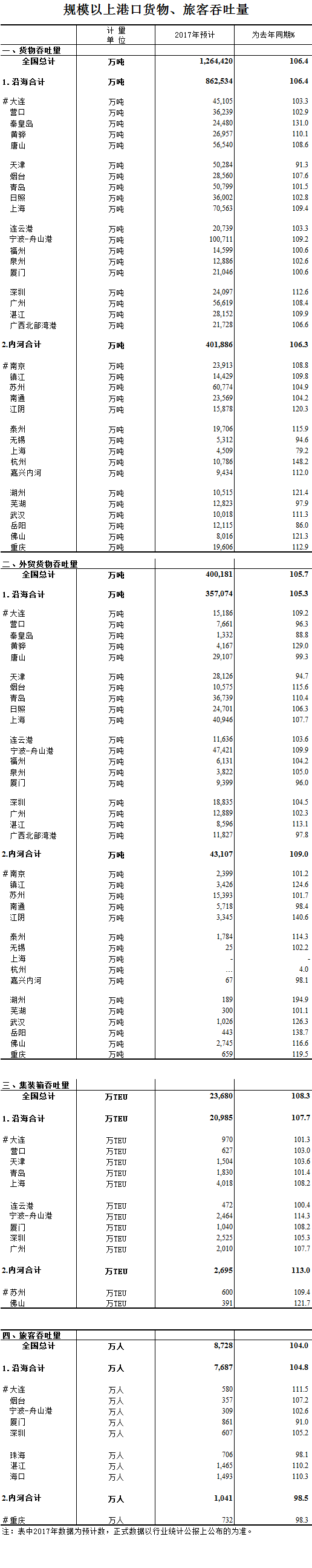 2017年规模以上港口货物、旅客吞吐量快报数据