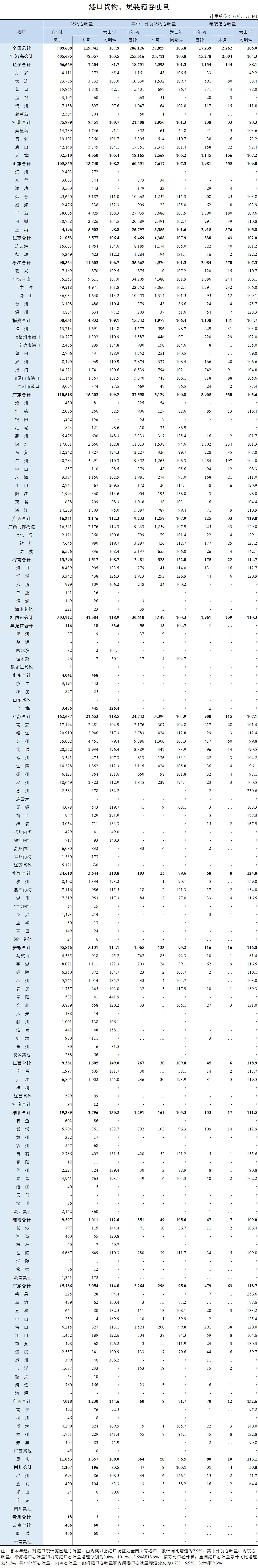 2019年8月全国港口货物、集装箱吞吐量