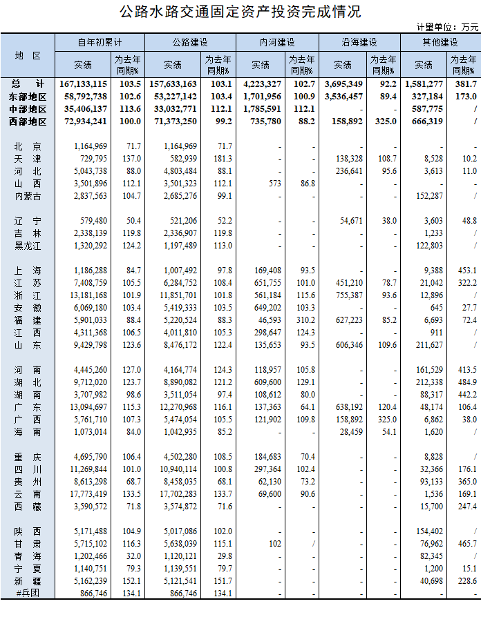 2019年9月公路水路交通固定资产投资完成情况