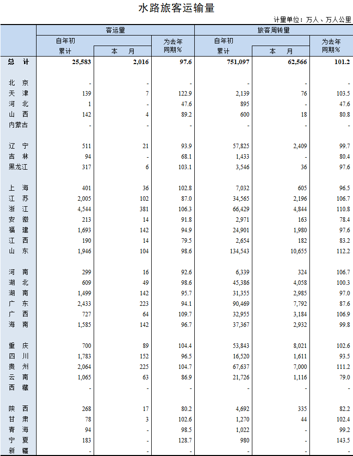 2019年11月水路旅客运输量
