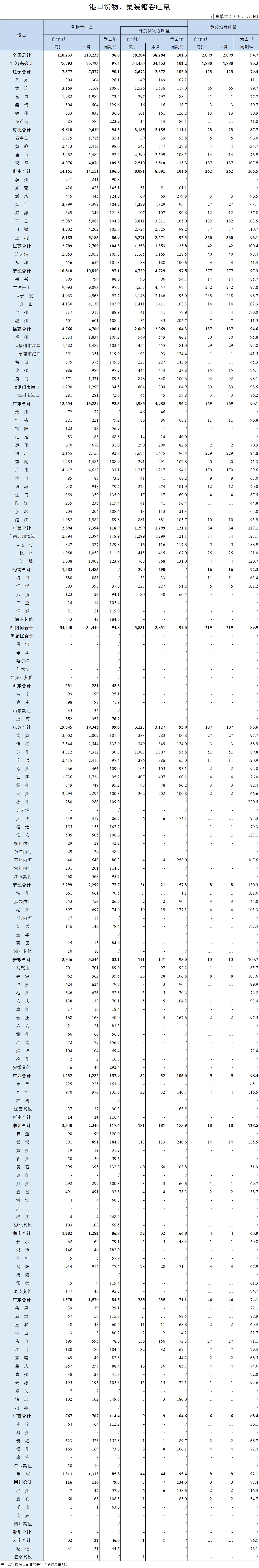 2020年1月全国港口货物、集装箱吞吐量